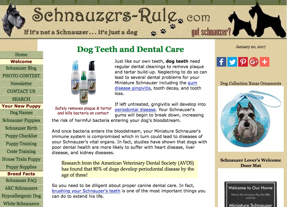 In this short list of top dental disease dogs, schnauzers come awful close to first place. It’s not uncommon to see these breeds present with the highest level of oral infection at the young age of 5. Visit the ‘Rule’ page for everything you ever wanted to know on Miniature Schnauzers. Great pictures and information!